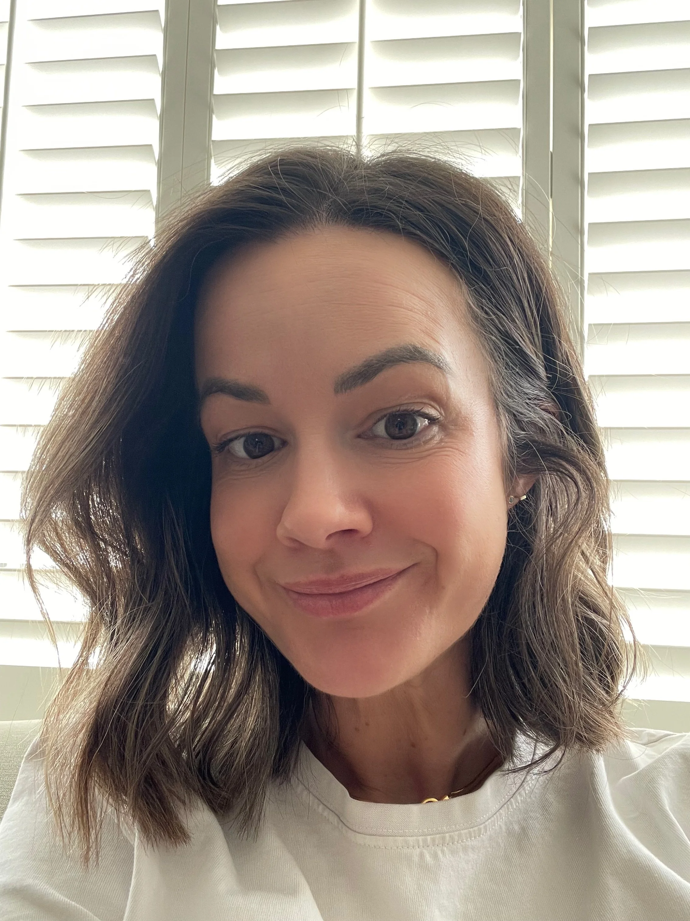 Close-up of a young woman with wavy brown hair and light skin, smiling at the camera, in front of white window shutters.
